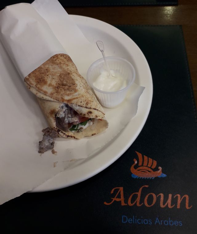 O Adoun tem duas entradas: por uma galeria e pela calçada da Brigadeiro Luís Antônio. Cheguei antes do meio-dia e o salão estava com as mesas e cadeiras bem vazias. Pedi um shawarma bovino – carne de boi, salsinha, tomate, cebola, pasta de alho e tahine, R$ 16,99.