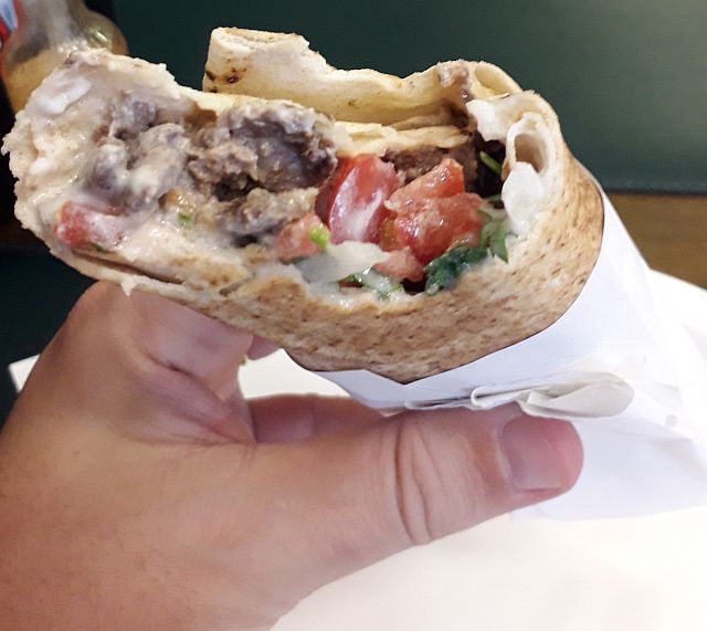 Gostei do shawarma “prático”. Carne em boa quantidade e macia dentro de uma pita (pão sírio) enrolada e bem fininha. O tahine, infelizmente, é daqueles líquidos e fica praticamente no final do “tubo” do shawarma. A cada mordida colocava antes um pouco da pasta de alho – que, pena, não é forte.