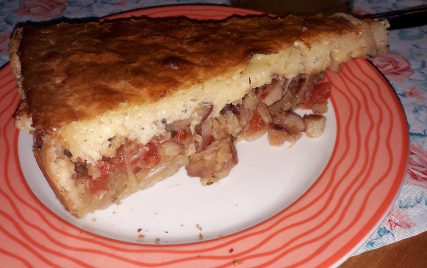 A torta é uma delícia! Pedaços cozidos de pinhão refogados com tomate, cebola e temperos dentro de uma massa que lembra ser a de liquidificador. Recheio ótimo, massa boa e um sabor total muito bom. Foi a primeira vez que comi torta de pinhão e já virei fã. A cerveja também estava boa., mas poderia estar mais gelada.