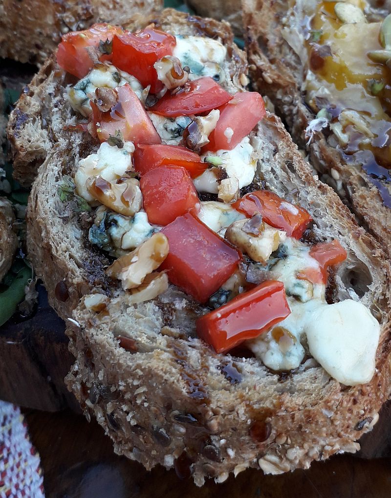Uma das bruschettas de tomate com gorgonzola: além de maravilhosa, é linda