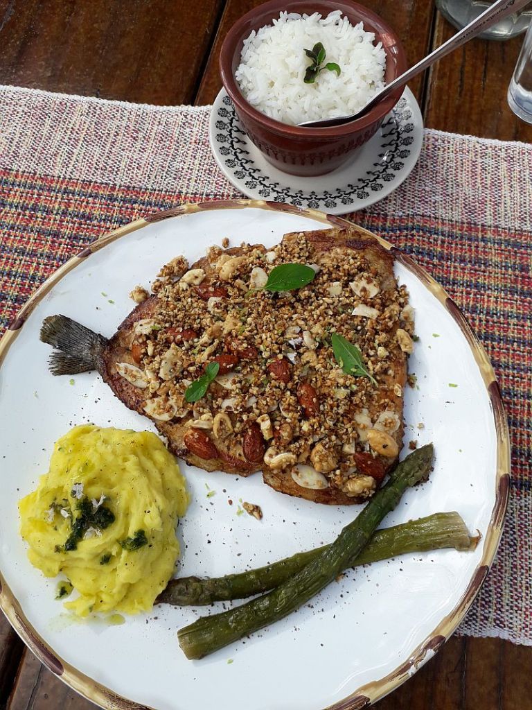 Minha esposa pediu a truta com castanhas e ervas, coberta com um mix de castanhas e acompanhada com arroz branco, purê de mandioquinha e aspargos verdes. Visualmente também estava bem bonito, e ela me assegurou que estava muito bom. Vale destacar que a cobertura de castanhas é bem generosa.