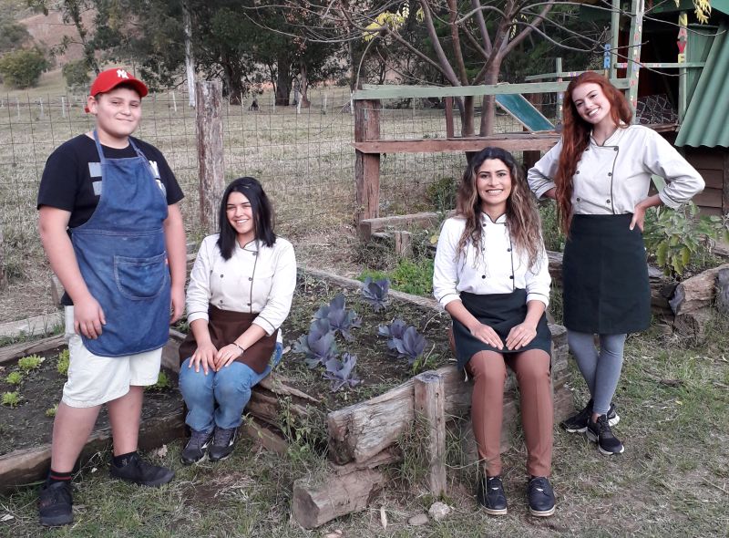A chef Jucélia com o filho Pedro e a sobrinha Francieli (à esquerda) e a enteada Sarah (à direita) junto à horta do Rancho: ele faz o atendimento nas mesas e as meninas trabalham com o chef na cozinha: trabalho familiar