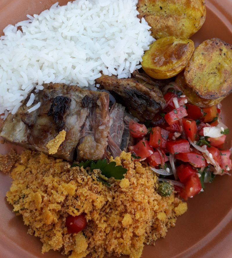 A travessa com as costelas e batatas, ornadas com grandes folhas de salsa, tem uma apresentação linda. Em cumbucas, vem o arroz, a farofa e a citronete. Em relação à carne, é muito boa. Havia pedaços mais passados e menos passados, preferi os últimos. As batatas derretiam. O arroz, branco, estava soltinho. A farofa, de farinha de milho flocada, adorei. Por fim, a citronete arrasou: tomates bem picados, alguns fios de cebola, bastante limão, outros temperos e gergelim. Tão simples e tão deliciosa.