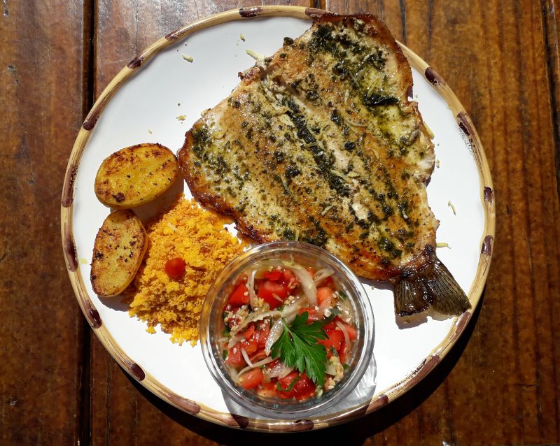 Este foi o último almoço de nossa estada por lá. E aí fui de truta, aliás, fomos de truta. Minha esposa é fã de peixes. Estava há alguns dias sem comer feijão e vi com a chef Jucélia se era possível uma truta no estilo comercial, com feijão. Ela disse ok. Ah, que bom.