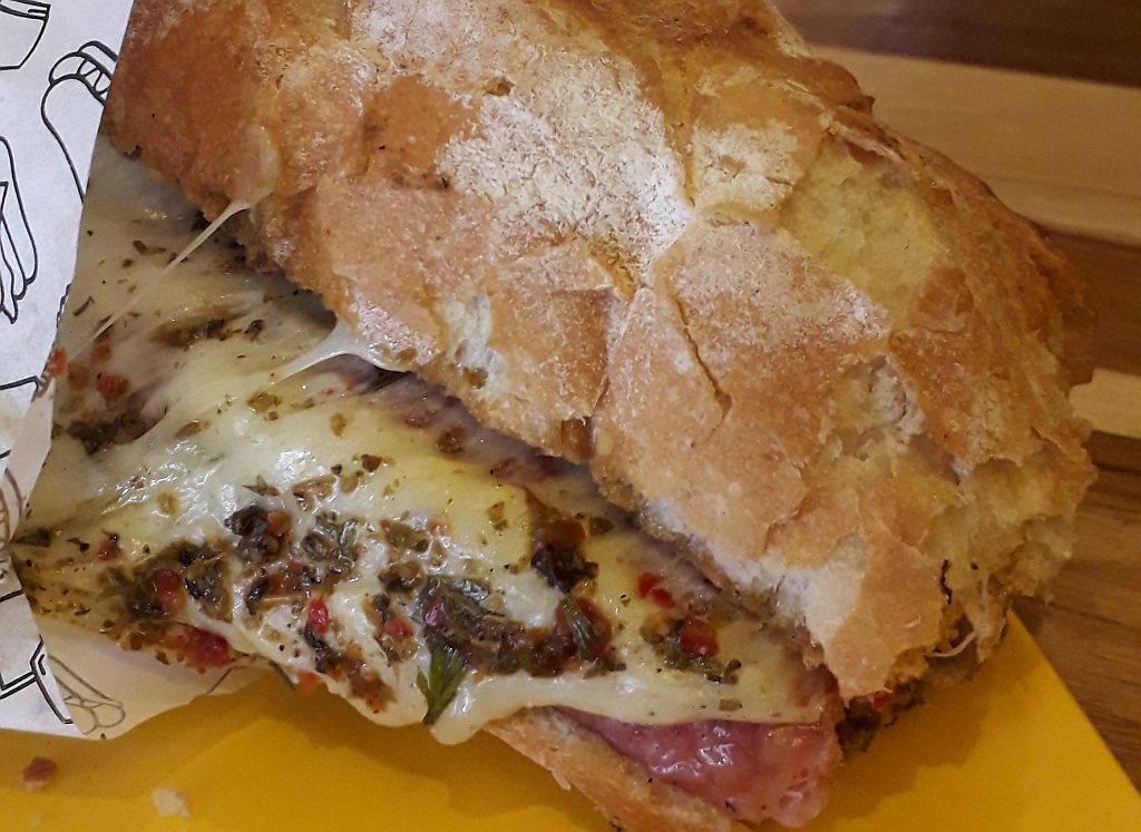 O sanduíche chegou quente à minha mesa. A linguiça estava bem passada, o chimichurri é marcante e saboroso, o queijo estava bem derretido e o pimentão assado e sem pele estava docinho.
