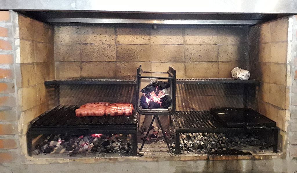 As mesas são coletivas no salão, e as luminárias chamam a atenção, pois originalmente eram moedores de carne. No fundo está a parrilla – churrasqueira à moda argentina – onde as linguiças de porco são assadas.