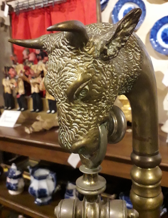 Enquanto a comida não chegou, fui ver o antiquário, que funciona na parte da frente do imóvel. Há peças muito interessantes como as que vi naquela noite, como uma balança com o adorno de cabeça de boi em metal, um lustre vermelho e um porco em madeira que integrava um carrossel, entre outras peças.