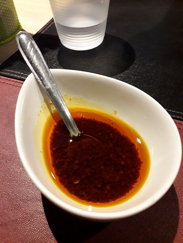 Fui ao primeiro andar, acessado por uma escada no final do salão, que estava cheio, e me sentei numa mesa para duas pessoas. Fui rapidamente atendido e pedi o único lamen da casa: Niu Rou Mian (R$ 32) – massa fresca artesanal, servida em caldo de carne acompanhada de fatias de carne, acelga chinesa, cebolinha picada e ovo marinado. Para beber, pedi água sem gás (R$ 4, garrafa plástica de 500 ml).