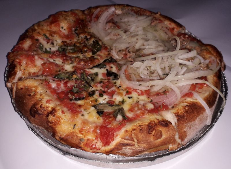 Pedi meio marguerita e meio atum – aqui em São Paulo a pizza de atum vem com cebola. A casa faz pizza com massa grossa e fina. Nunca escolhi. Acho que sempre comi a de massa grossa, deve ser a tradicional.
