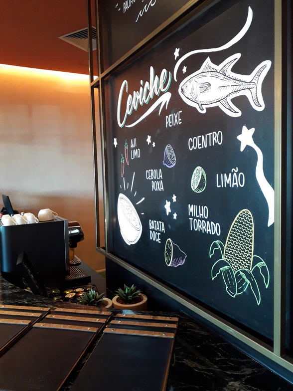 O QCeviche! tem entrada independente e também por dentro do hotel. O salão é bem grande, com várias mesas, bar com cadeiras, paredes de tom salmão, ótimo ar condicionado (fundamental no Rio de Janeiro) e painéis com receitas de ícones como ceviche e pisco sour (que o Chile também reivindica como sendo “seu”).