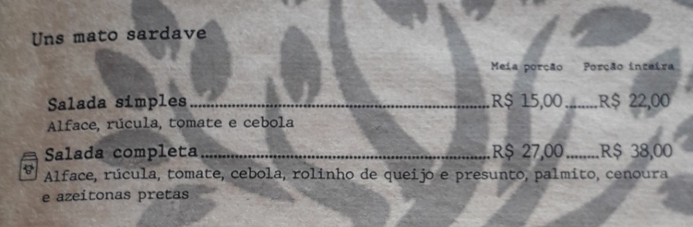 Voltando ao cardápio do restaurante Fontebasso, seguem os nomes das seções: “Os vinhos que nóis faiz”; “Pá nóis vê o mundo girá”, com as bebidas alcoolicas; “Árco cum limão isprimido i açuca”, com as caipirinhas e caipiroskas; “Pá nóis num ficá beubo”, com sucos, águas, refrigerantes; “Pá nóis entorta o caneco”, com as cervejas; “Pá acumpanhá”; “Uns mato sardave”, com as saladas; “Pá enche a pança”, com as massas — meia porção com 500 g e porção inteira com um quilo; e “Pá petiscá” — meia porção com 500 g e porção inteira com um quilo, que pode ser isca de tilápia, linguiça, panceta e polenta etc.