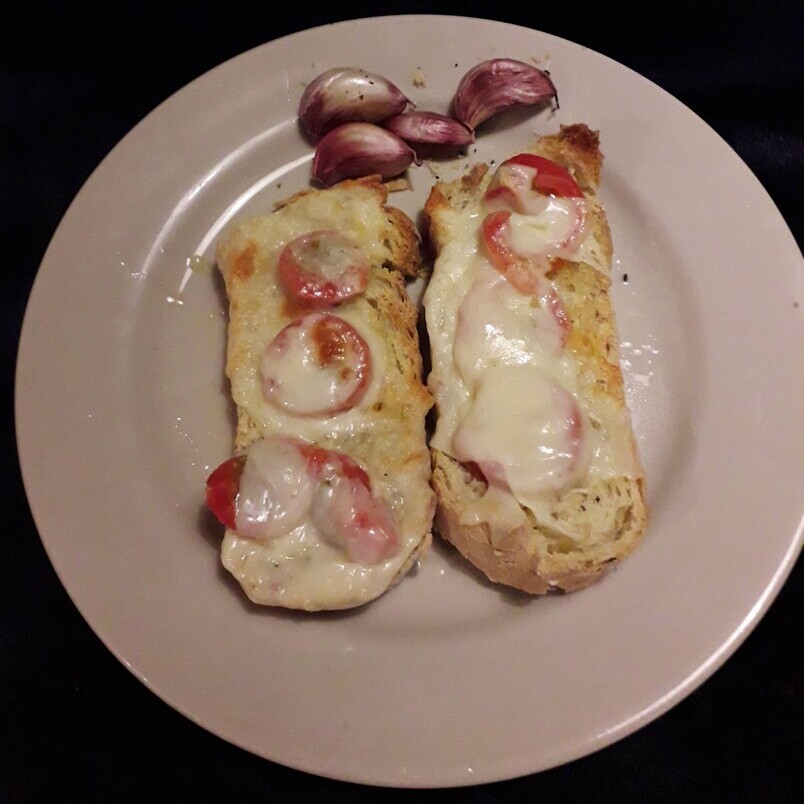 Se senti falta de um fogão ou um fogareiro, senti, mas o forninho elétrico quebrou super bem o galho. E lá fiz, em mais de uma noite, uma espécie de bruschetta, com um pão multigrãos da padaria Viola, de Santo Antônio do Pinhal. Cortado em fatias, coloquei muçarela, tomate e azeite em cima e as assei no forninho. Junto alguns dentes de alho, que viraram um ótimo purê. Delícia!