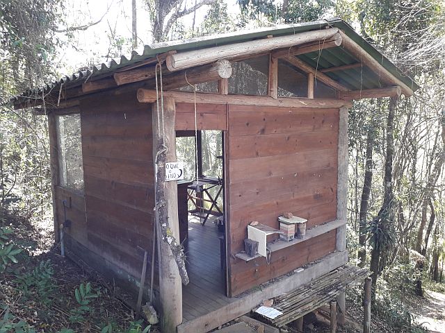 Desde a estrada até o estabelecimento, você percorre uma trilha que não passa de 200 metros entre uma mata. Por isso que, de fato, é uma casa da mata. A construção é pequena e de madeira. Na entrada, há uma pequena colmeia de abelha jataí (Tetragonisca angustula), que são nativas do Brasil e não têm ferrão. Portanto, não fique com medo de levar uma ferroada.