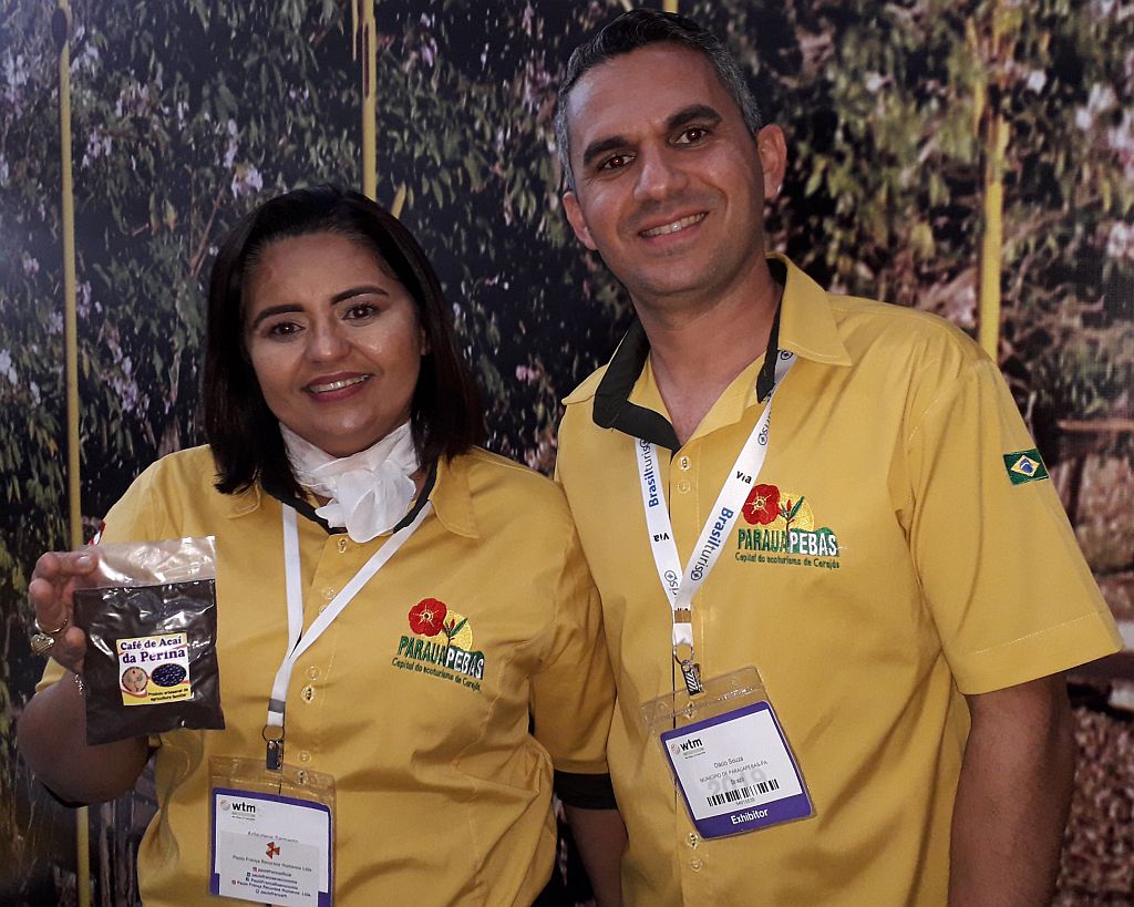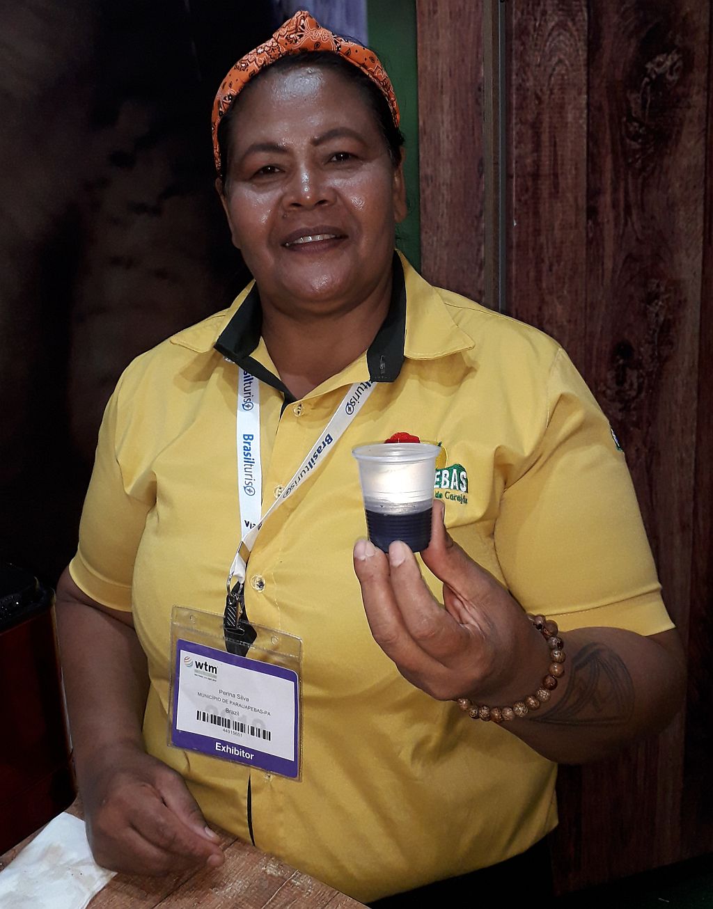 No estande da cidade na WTM Latin America, o “café” de açaí podia ser provado. Quem o fazia era a simpática dona Perina.