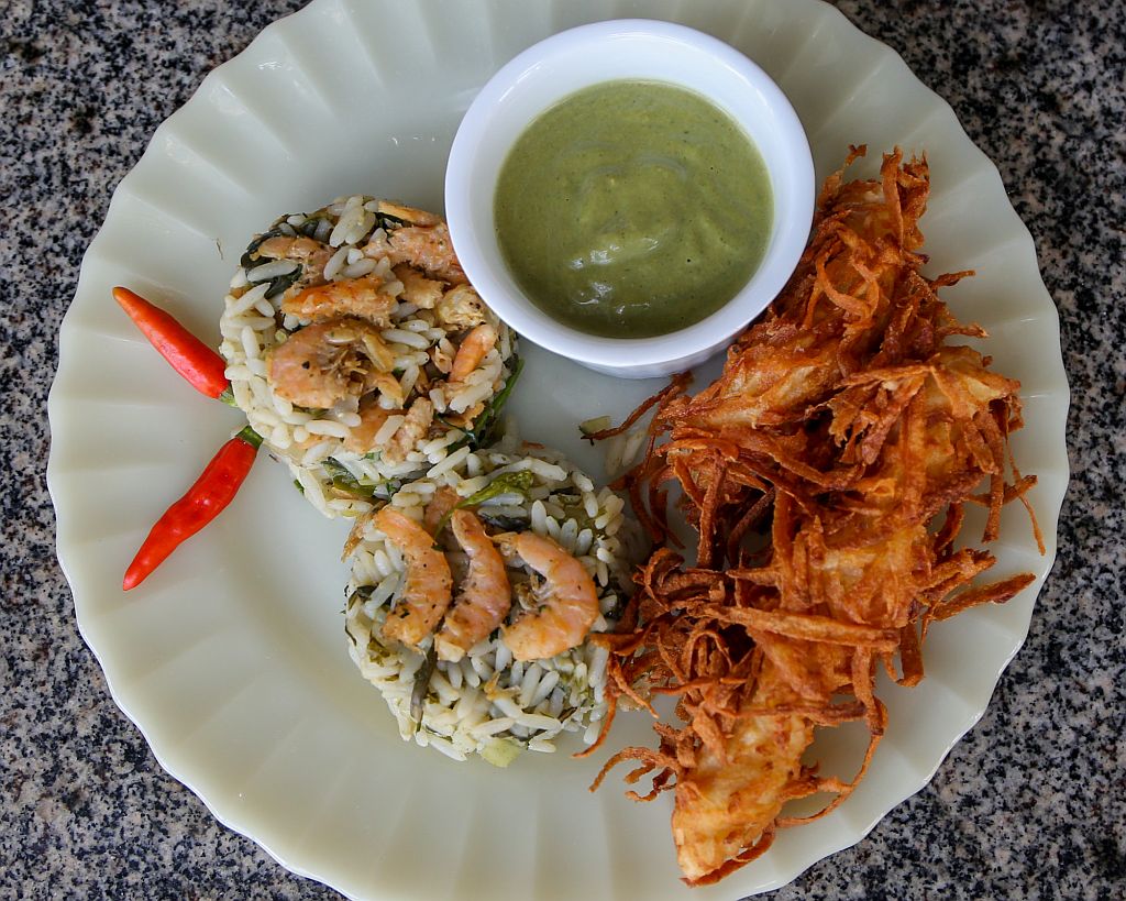 Muitas foram as combinações apresentadas na montagem dos pratos. Filé de gó empanado na batata, acompanhado com molho verde, de chicória e jambu, somado ao arroz verde com camarão regional foi a rica receita e aposta de Landi Gaia, de 42 anos.
