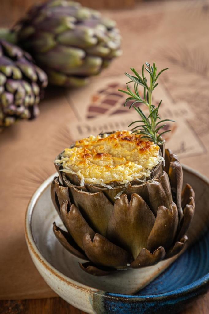 Entrada: Fundo de alcachofra com recheio de truta defumada com parmesão; Fundo de alcachofra com recheio de mix de cogumelos gratinada com muçarela; Fundo de alcachofra com queijos boursin e feta gratinados; Alcachofra (flor inteira) ao vinagre de frutas vermelhas; Alcachofra (flor inteira) recheada de gorgonzola