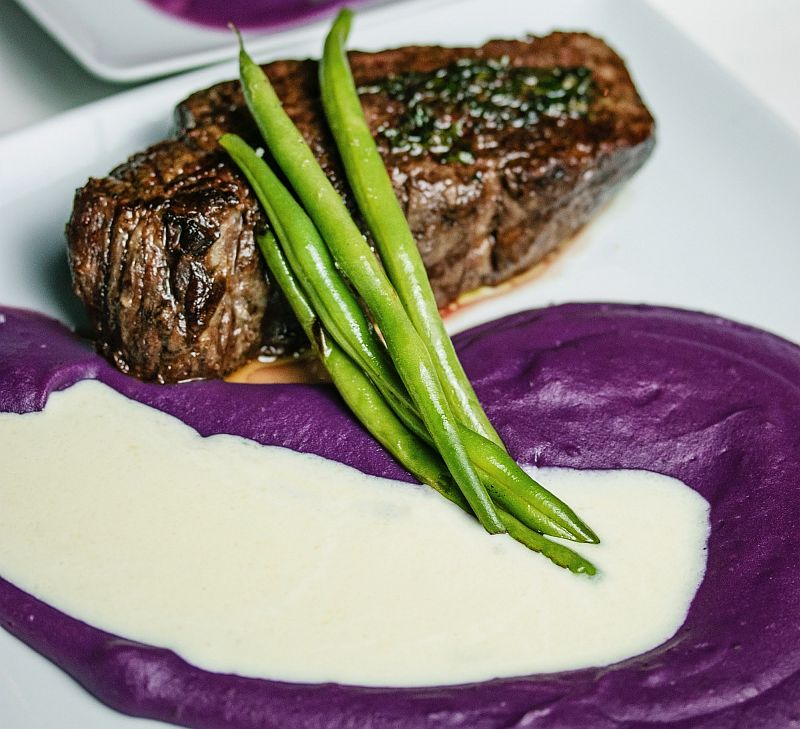 O cowboy steak com purê de batata roxa, creme de gorgonzola e vagens holandesas (fotos divulgação)