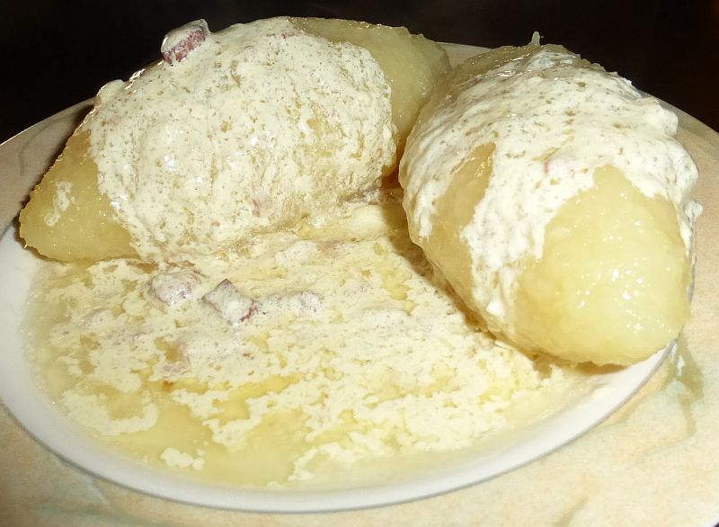 O cepelinas é servido coberto fartamente com creme de leite e pedacinhos de bacon fritos. Entendeu agora por que escrevi que o prato é uma “bomba calórica”?
