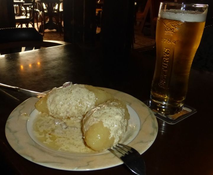 E o que é de fato esta delícia lituana? É uma “bomba calórica”, mas muito, muito saborosa! O cepelinas é um bolão de batata cozido recheado de carne, geralmente de porco, mas também pode ser de cogumelos ou queijo. O que comi era recheado com carne suína.
