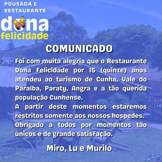 Em um post publicado em 31 de maio passado no Instagram, o chef Miro, a esposa dele, Lu, e o filho do casal, Murilo, assinaram um comunicado ao público (leia abaixo): o restaurante da pousada passaria a atender apenas os hóspedes.