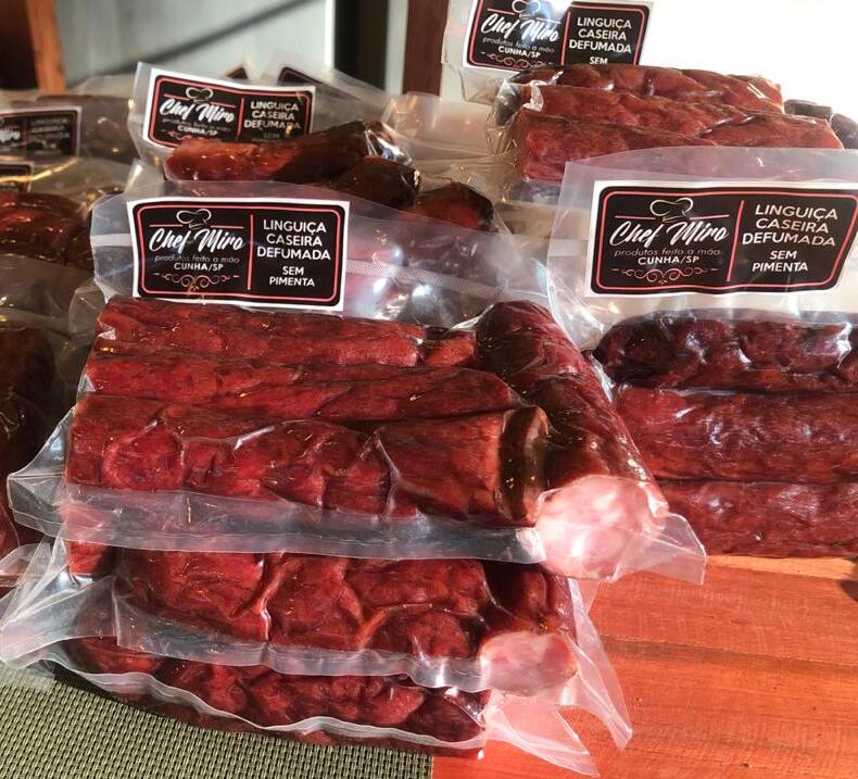 O chef Almiro Pontes, mais conhecido como Miro, dono junto com a esposa, Lu, da Pousada e Restaurante Dona Felicidade, em Cunha no interior de São Paulo, ampliou a linha de defumados. Há pouco tempo o chef Miro começou a fazer e defumar linguiças de porco (com e sem pimenta). Assim como as trutas, que ele defuma há oito anos, o embutido pode ser degustado e comprado no restaurante e também em dois revendedores na linda Estância Climática situada entre o Vale do Paraíba e a Serra do Mar, distante 230 quilômetros da capital paulista.