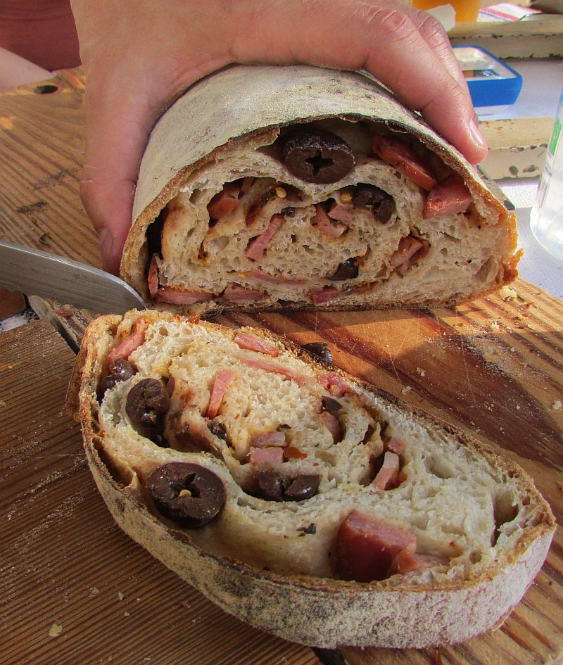 Na mesa da Forno Fecchio na feira, eu provei o pão de centeio (bom), pão recheado de presunto e queijo (ótimo) e pão recheado com calabresa e azeitona (maravilhoso). Este último, meu destaque dos três, tinha a massa leve, casca crocante e muito recheio. Um show!