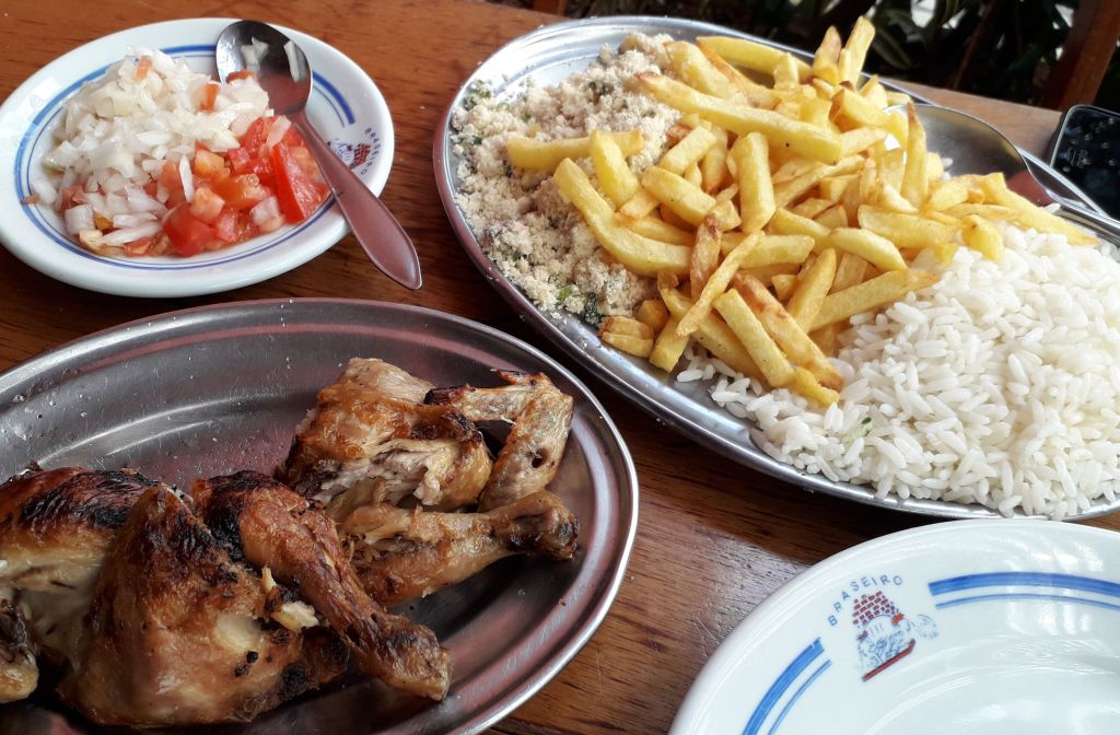 O franguinho estava ótimo e suculento, e foi consumido com as mãos, claro. As garnições chegaram quentes e em boa quantidade para duas pessoas.