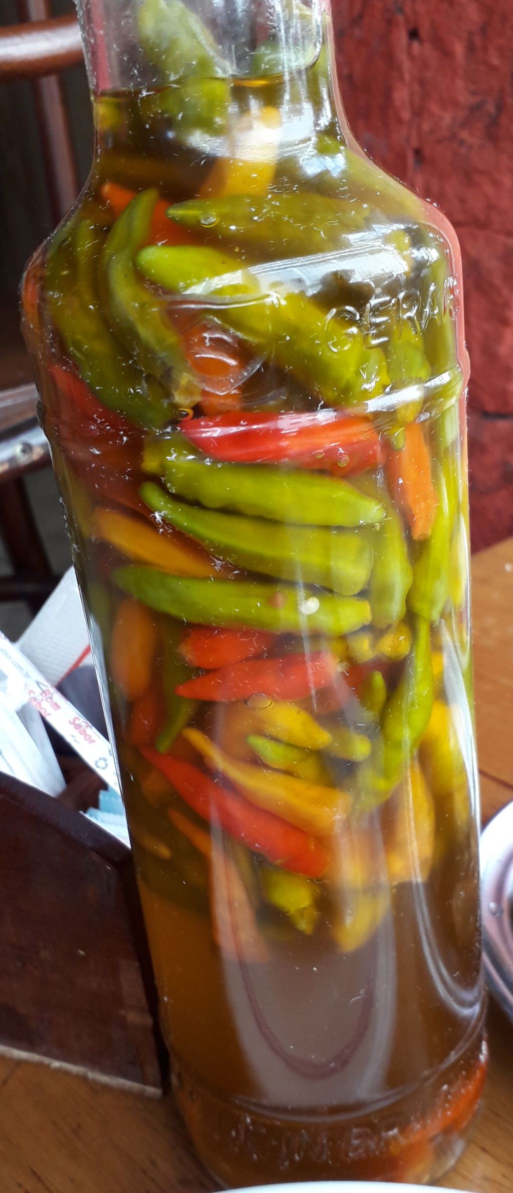 Ah! Como bom pimenteiro que sou, pedi ao garçom a pimenta – de preferência a caseira, não a industrializada. Minutos depois, ele trouxe uma garrafa com pimentas verdes e vermelhas conservadas no óleo. “Cuidado que é forte!”, o garçom me avisou. Hummm, estava boa demais! Ajudou a deixar o almoço mais saboroso.