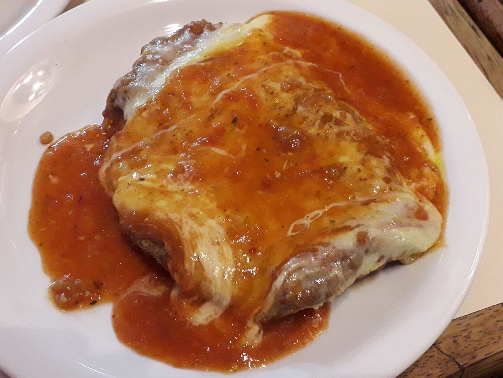 Minutos depois a garçonete, falando português com sotaque espanhol da América do Sul, traz o prato com o filé. Hummmm… Chegou quente, com o queijo muçarela bem derretido e muito molho de tomate. Tudo do jeito que gosto nesta receita. A carne estava macia, saborosa mesmo. Perfeito!