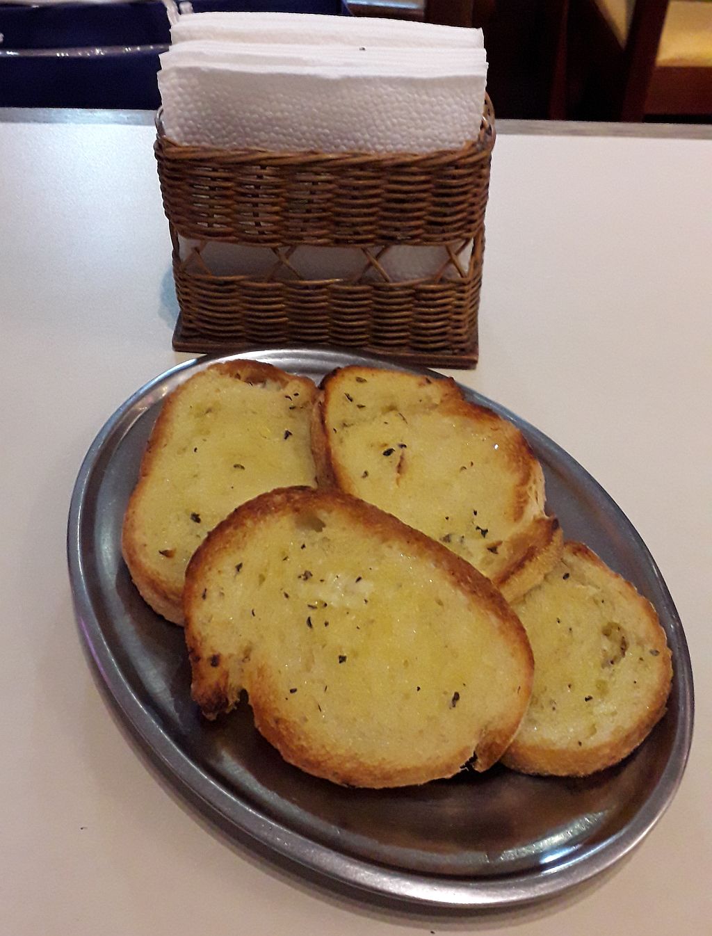 Pedi um dos carros-chefes da casa na hora do almoço, o filé à parmegiana (individual). O prato é servido com arroz branco e batata palha ou salada. Preferi comer a carne apenas com a salada. Como cortesia, trouxeram uma porção de pão italiano quentinho com azeite de oliva, orégano e alho. Gostoso.