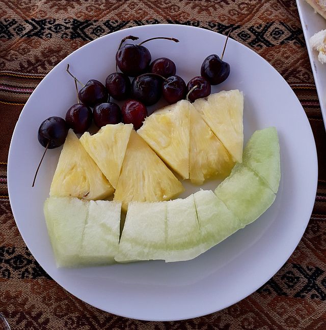 Sim, há vinho e canapés e mais um monte de coisas gostosas: mix de amêndoas e frutas secas, frutas in natura – afinal é uma das riquezas do Chile, né? –, azeitonas, sanduíches e alguma coisa doce, como bolo. Olha, me surpreendi positivamente com esta variedade e qualidade! Quem prepara a mesa é, novamente, a dupla do guia com o motorista.